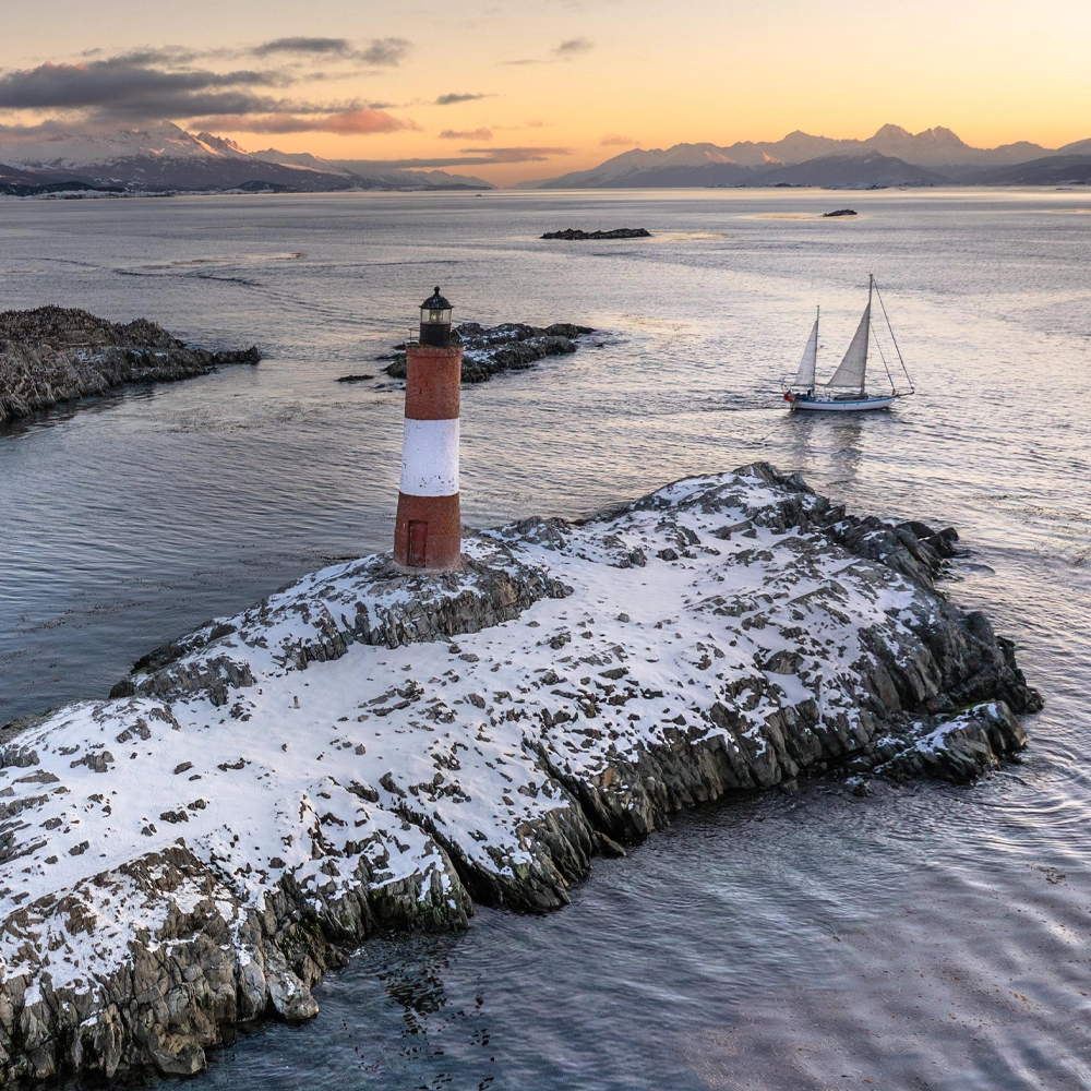 Chegaremos ao icônico farol conhecido como "o farol do fim do mundo", rodeado por corvos-marinhos imperiais, pombas-antárticas e gaivotas. Um momento ideal para tirar fotos e contemplar a imensidão do canal.